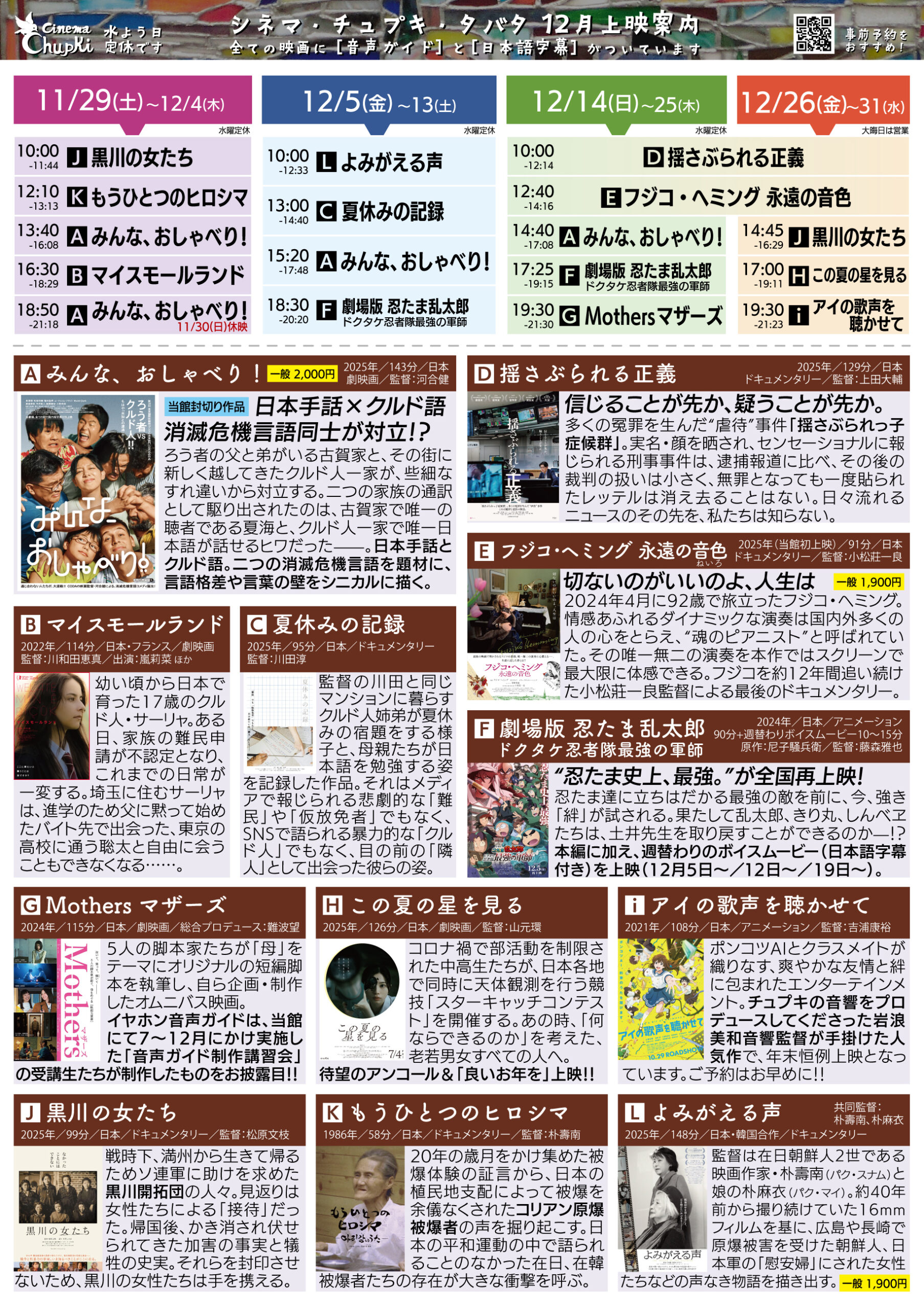 - <事前予約をお勧め>25年12月の上映スケジュールのお知らせ