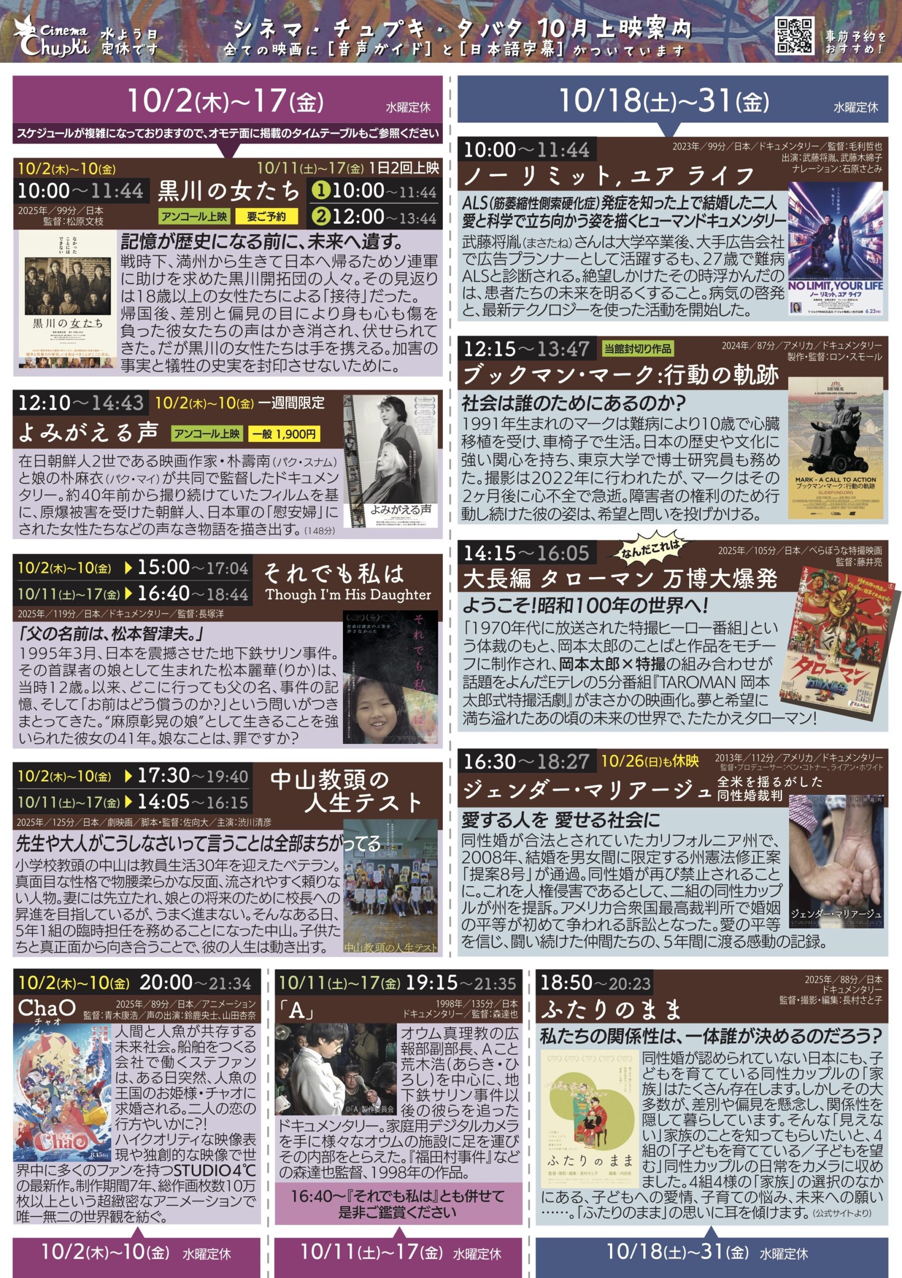 - <事前予約をお勧め>25年10月の上映スケジュールのお知らせ(10/14更新)